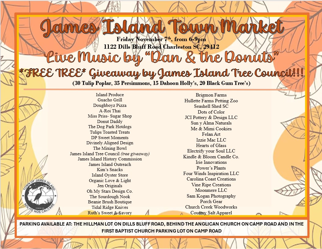 The James Island Town Market is held on the first Friday of each month at the James Island Town Hall from 6 p.m. to 9 p.m.  We have music, vendors, food trucks, and family activities and recommend bringing water and a lawn chair/blanket.
